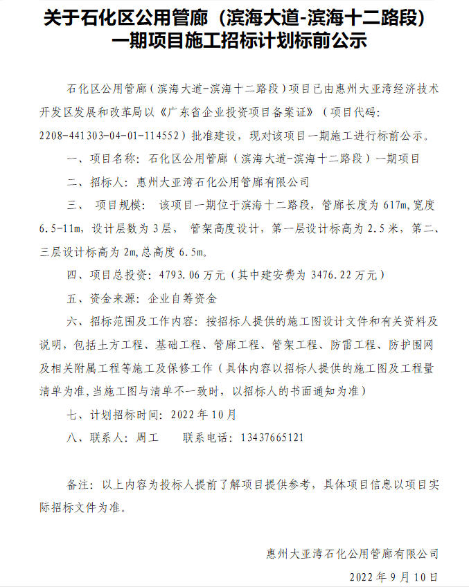 关于石化区公用管廊(滨海大道段)项目施工招标计划标前公示