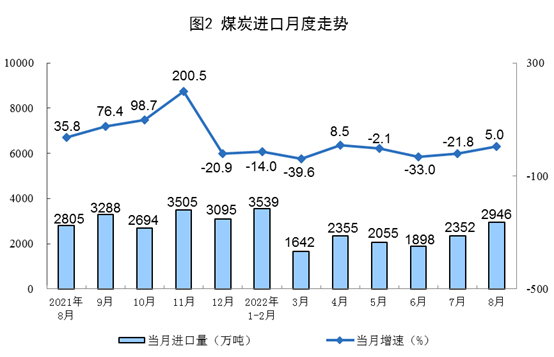 原煤生产保持稳定,进口由降转升。8月份,生产原煤3.7亿吨,与上月基本持平,同比增长8.1%,增速比上月回落8.0个百分点,日均产量1195万吨。进口煤炭2946万吨,同比增长5.0%,上月为下降21.8%。