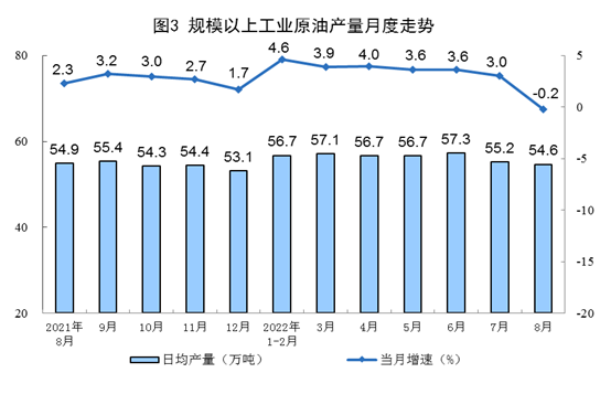 1—8月份,生产原油13694万吨,同比增长3.2%。进口原油33018万吨,同比下降4.7%。