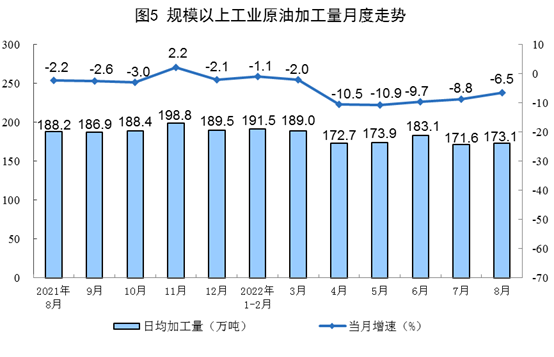 原油加工量降幅有所收窄。8月份,加工原油5366万吨,同比下降6.5%,降幅比上月收窄2.3个百分点,日均加工173.1万吨。1—8月份,加工原油43489万吨,同比下降6.3%。