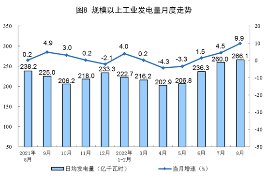 分品种看,8月份,火电、风电增速加快,太阳能发电有所放缓,水电同比下降,核电降幅收窄。其中,火电同比增长14.8%,增速比上月加快9.5个百分点;风电增长28.2%,增速比上月加快22.5个百分点;太阳能发电增长10.9%,增速比上月回落2.1个百分点;水电下降11.0%,上月为增长2.4%;核电下降0.6%,降幅比上月收窄2.7个百分点。