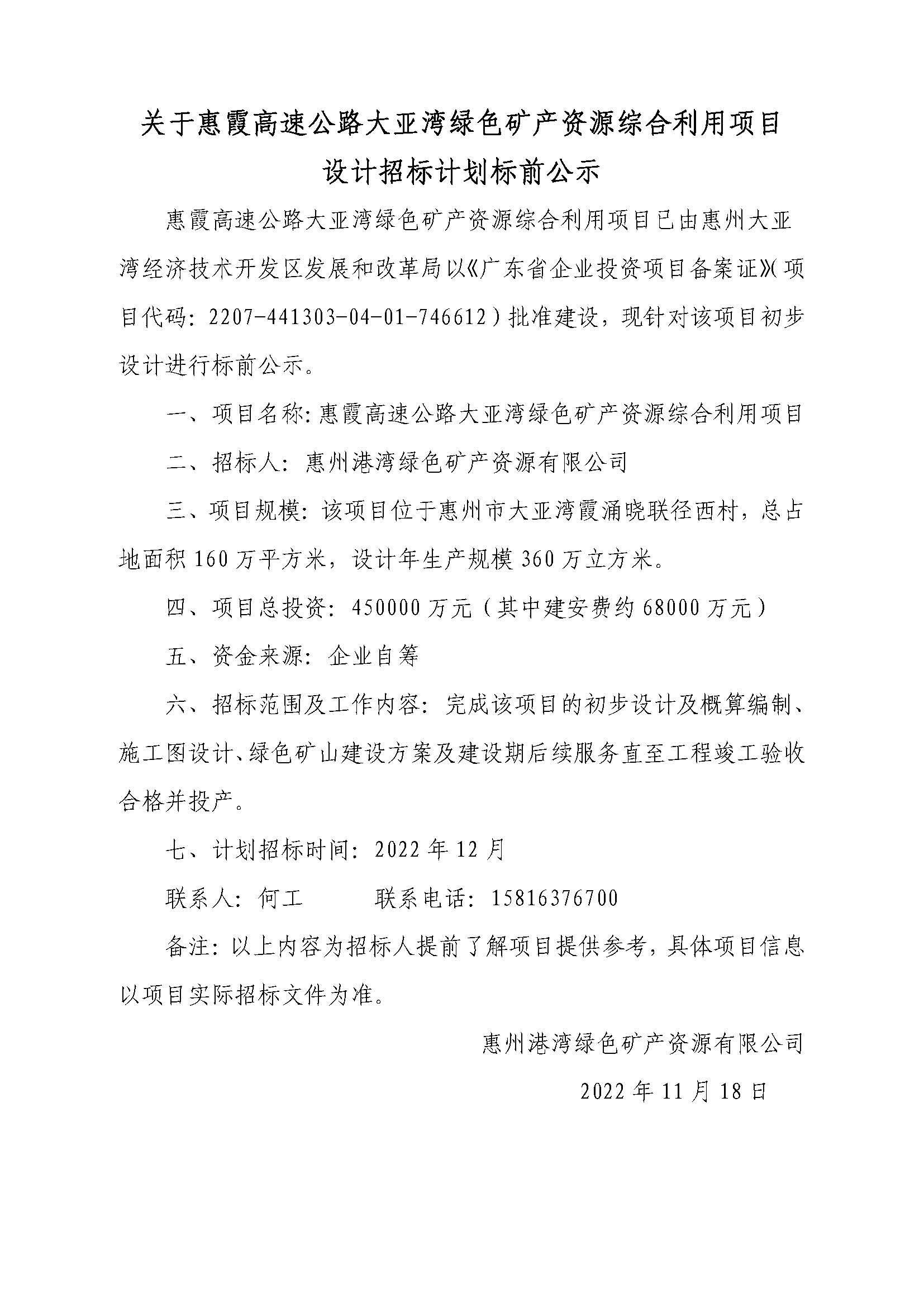 关于惠霞高速公路大亚湾绿色矿产资源综合利用项目设计招标计划标前公示