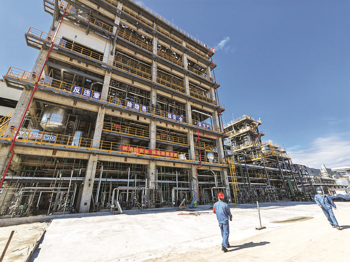 在附近的惠州宇新新材料有限公司(以下简称“宇新新材”)项目现场,年产15万吨顺酐装置高高耸立。2021年12月28日,该项目正式投产。“顺酐装置自投产以来,一直满负荷高质量运行,各项指标在行业内领先。”谭良谋介绍,该项目生产装置是全球单套产能最大的顺酐装置,采用全球先进的工艺包、优秀的顺酐催化剂和安全先进的顺酐反应器等,在满负荷生产的情况下,可年产液体顺酐15万吨。此外,该装置每小时副产高压蒸汽近200吨,除满足项目自有装置动力需求外,还有近一半富余蒸汽外供其他企业使用,大大提高了产品附加值。