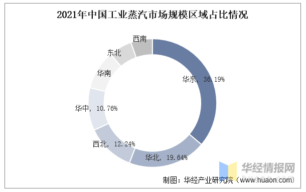 我国工业企业蒸汽供应的主要方式主要为集中供热,一般集中在北方地区和企业集群区,如化工区、纺织区、高新技术开发区、经济开发区、产业园区等。数据显示,目前我们工业蒸汽市场集中分布于华东、华北、西北和华中地区,市场规模占比分别为36.19%、19.64%、12.24%、10.76%。