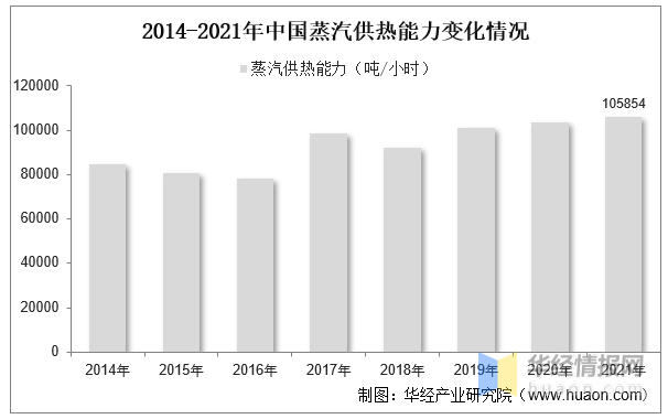 在工业生产中,蒸汽作为一种用途极为广泛的能源与几乎所有的企业有着不可分割的联系。大量的工业用水和以煤炭为主的能源被用来产生蒸汽,蒸汽的热力又被用来实现工业生产工艺过程。整体来看,我国蒸汽供热能力在不断提高,2014年中国蒸汽供热能力约为8.47万吨/小时,2021年上升至10.59万吨/小时。
