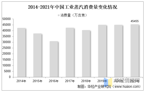 从需求端看,2014年以来我国工业蒸汽行业消费量来呈现出波动变化趋势。2019-2021年期间,中国工业蒸汽消费量表现得较为稳定,保持在4.5亿吉焦以上。