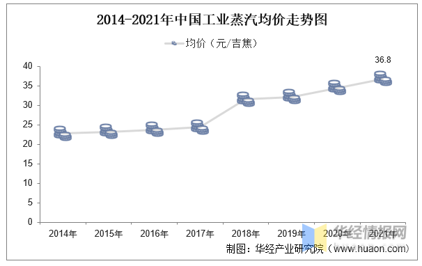 目前,工业蒸汽价格大部分受到政府部门调控,政府通过补贴等形式调节当地工业蒸汽市场。近年来,我国工业蒸汽平均价格不断走高,2021年上升至36.8元/吉焦。