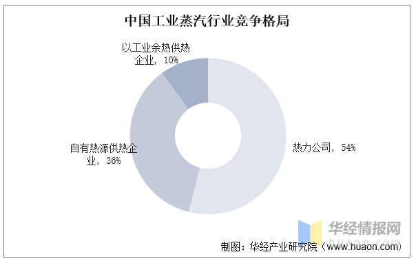 目前,国内工业蒸汽企业类型主要包含热力公司、自有热源供热企业以及自有热源工业企业。热力公司负责城市供热管网的铺设与维修,自上游热电联产厂购买高压蒸汽,通过热力站或其他设备将其转换为中、低压蒸汽和低温热水,为下游居民及非居民提供供热服务,该类型供热企业市场规模约占行业的54%;自有热源供热企业指拥有大、中型区域锅炉房的热力公司,市场份额约为36%;以工业余热供热企业为代表的新能源和可再生能源供热企业约占比10%。