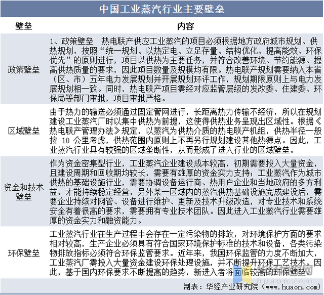 我国工业蒸汽行业主要进入壁垒包括政策、区域、环保以及资金和技术壁垒等四个方面。