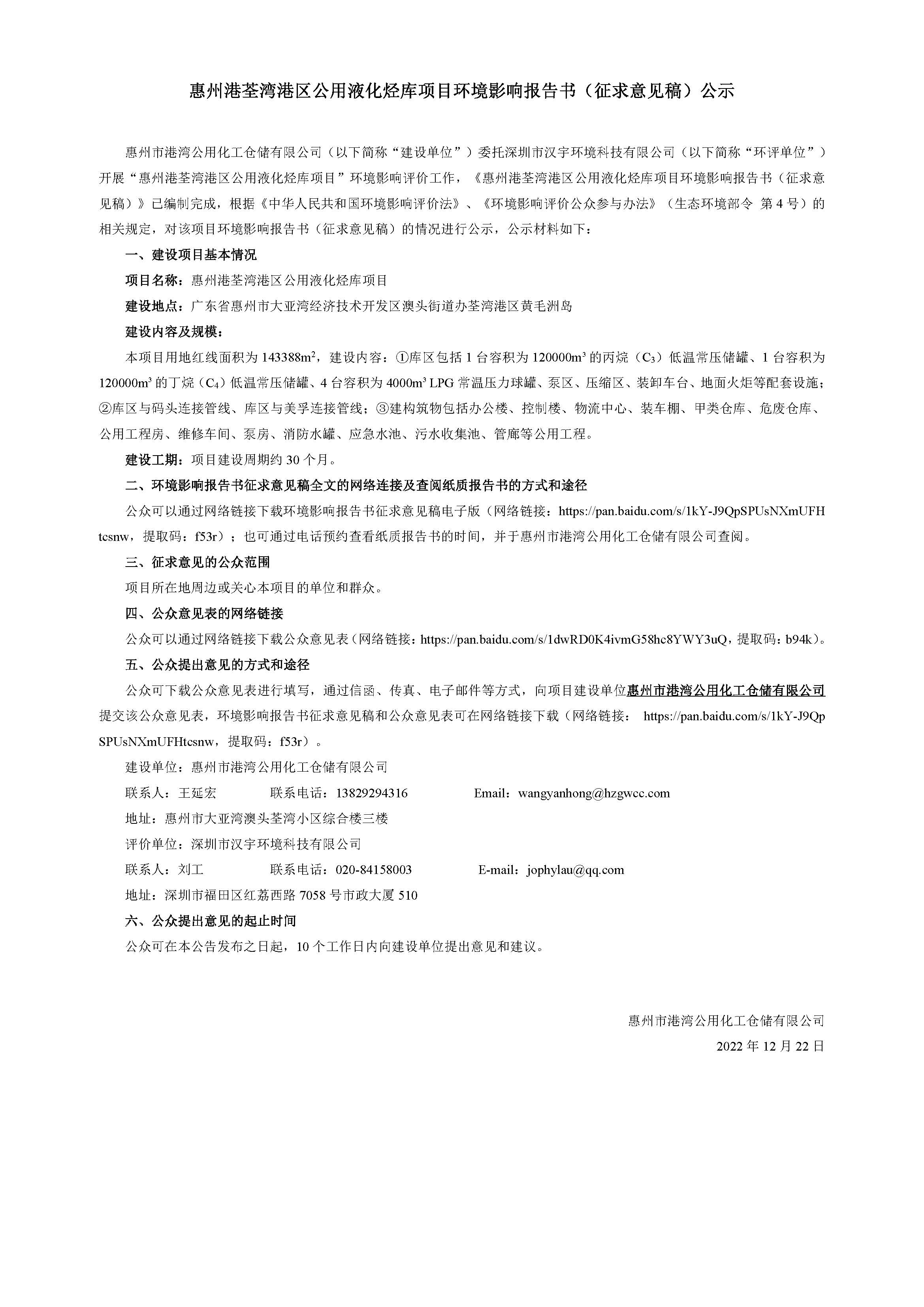 惠州港荃湾港区公用液化烃库项目境影响报告书(征求意见稿)公示