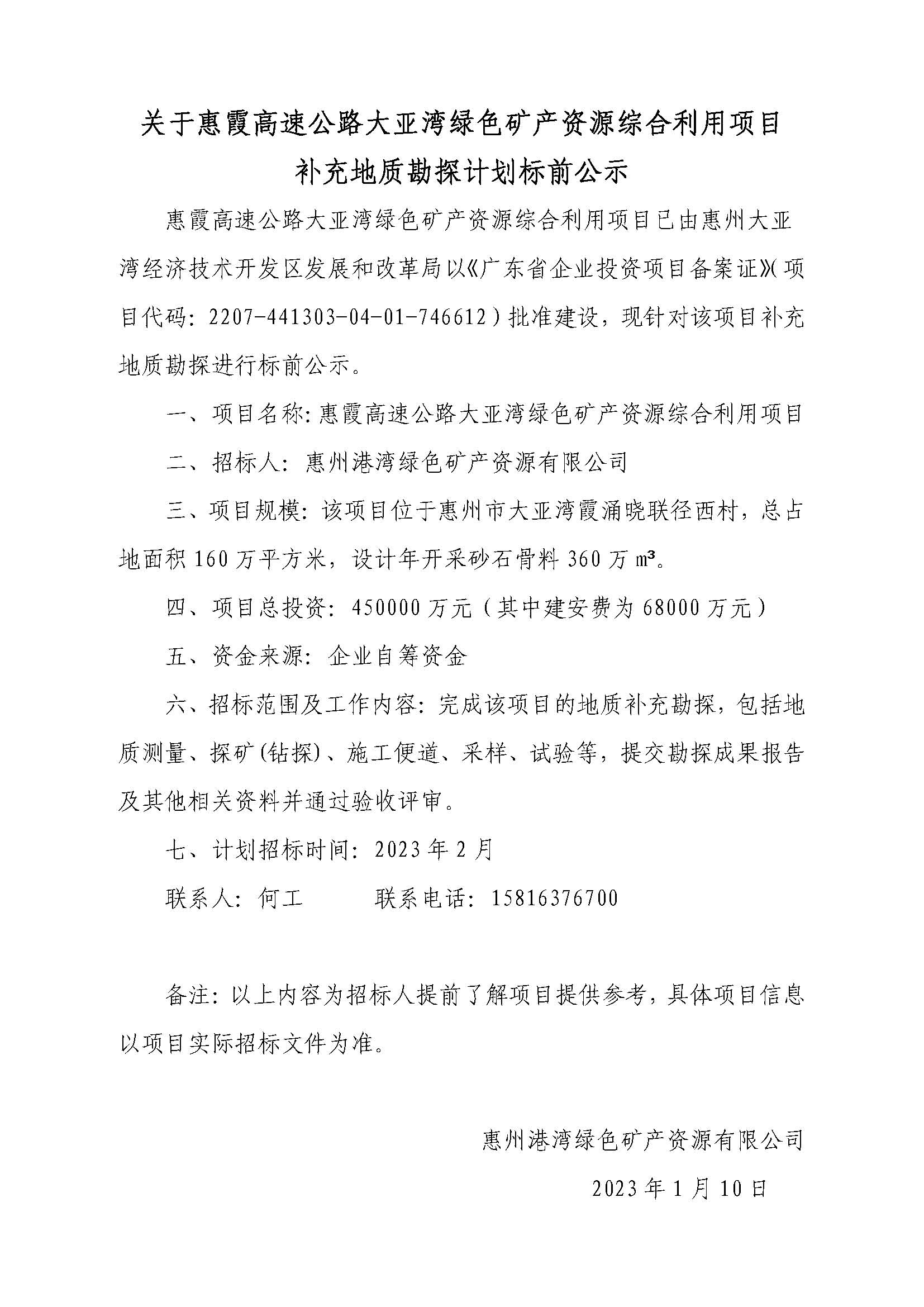关于惠霞高速公路大亚湾绿色矿产资源综合利用项目补充勘探计划标前公示