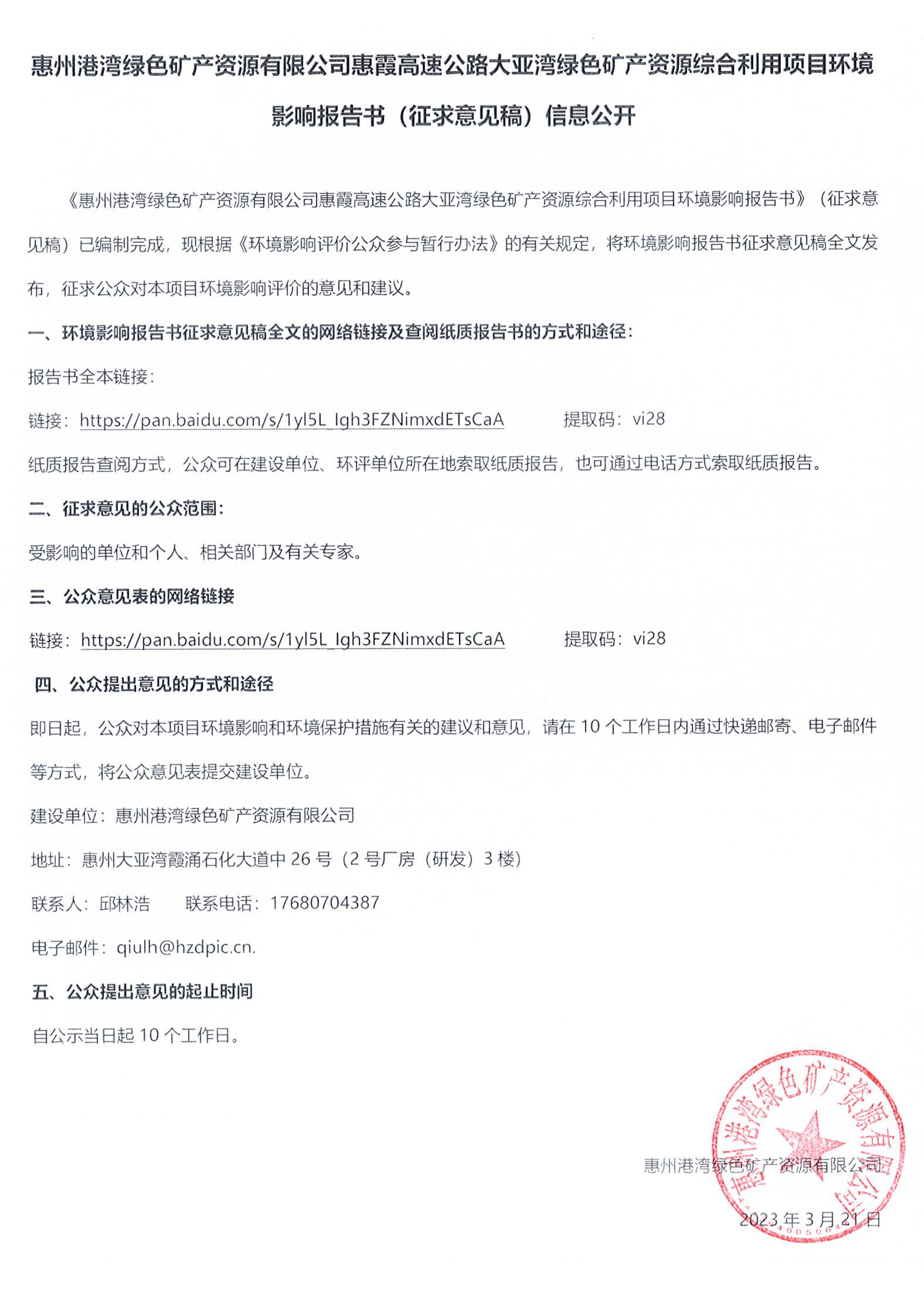 惠州港湾绿色矿产资源有限公司惠霞高速公路大亚湾绿色矿产资源综合利用项目环境影响报告书(征求意见稿)信息公开