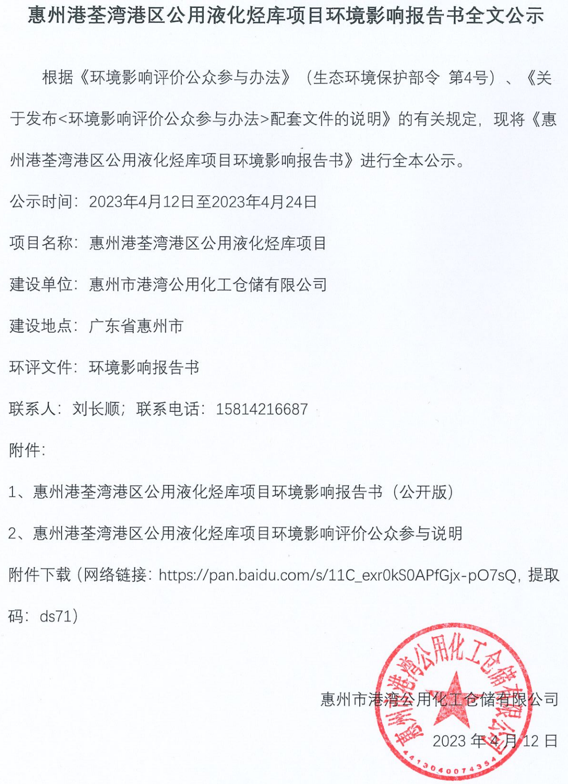 惠州港荃湾港区公用液化烃库项目境影响报告书(征求意见稿)公示