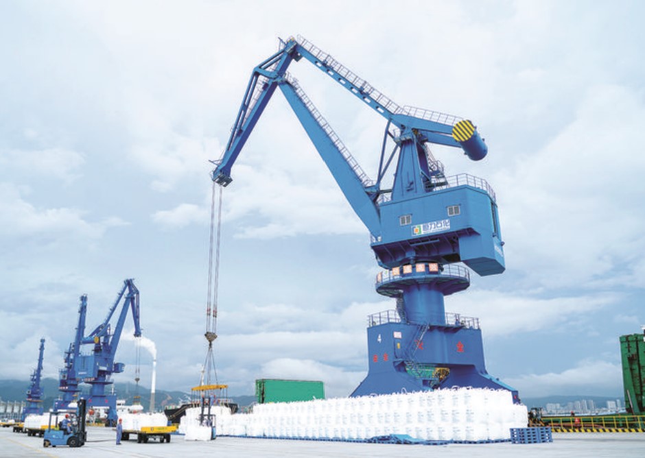 离PTA主装置区约一公里处,便是恒力石化(惠州)有限公司通用码头。码头上是项目最繁忙的地方,只见一辆辆拖车将一包包PTA产品拉到码头上有序码垛好;码头泊位上停靠着3艘轮船,高大的门机起重机将码垛好的PTA产品吊到船舱。