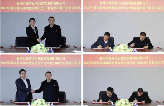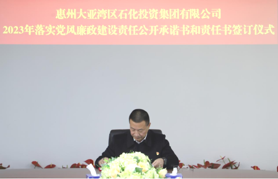 为持续加强党风廉政建设,进一步筑牢廉洁自律防线。1月18日,惠州大亚湾区石化投资集团有限公司举行2023年落实党风廉政建设责任公开承诺书和责任书签订仪式。公司管理层成员、纪检干事、中层干部、派驻下属企业干部、监察审计部工作人员、采购工作人员、财务工作人员、工程工作人员参加签订仪式。