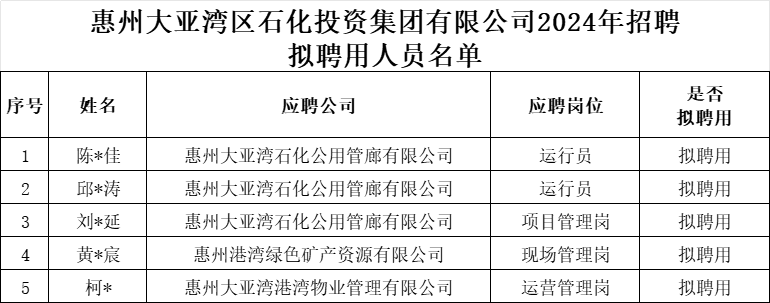 附件:惠州大亚湾区石化投资集团有限公司2024年招聘拟聘用人员名单