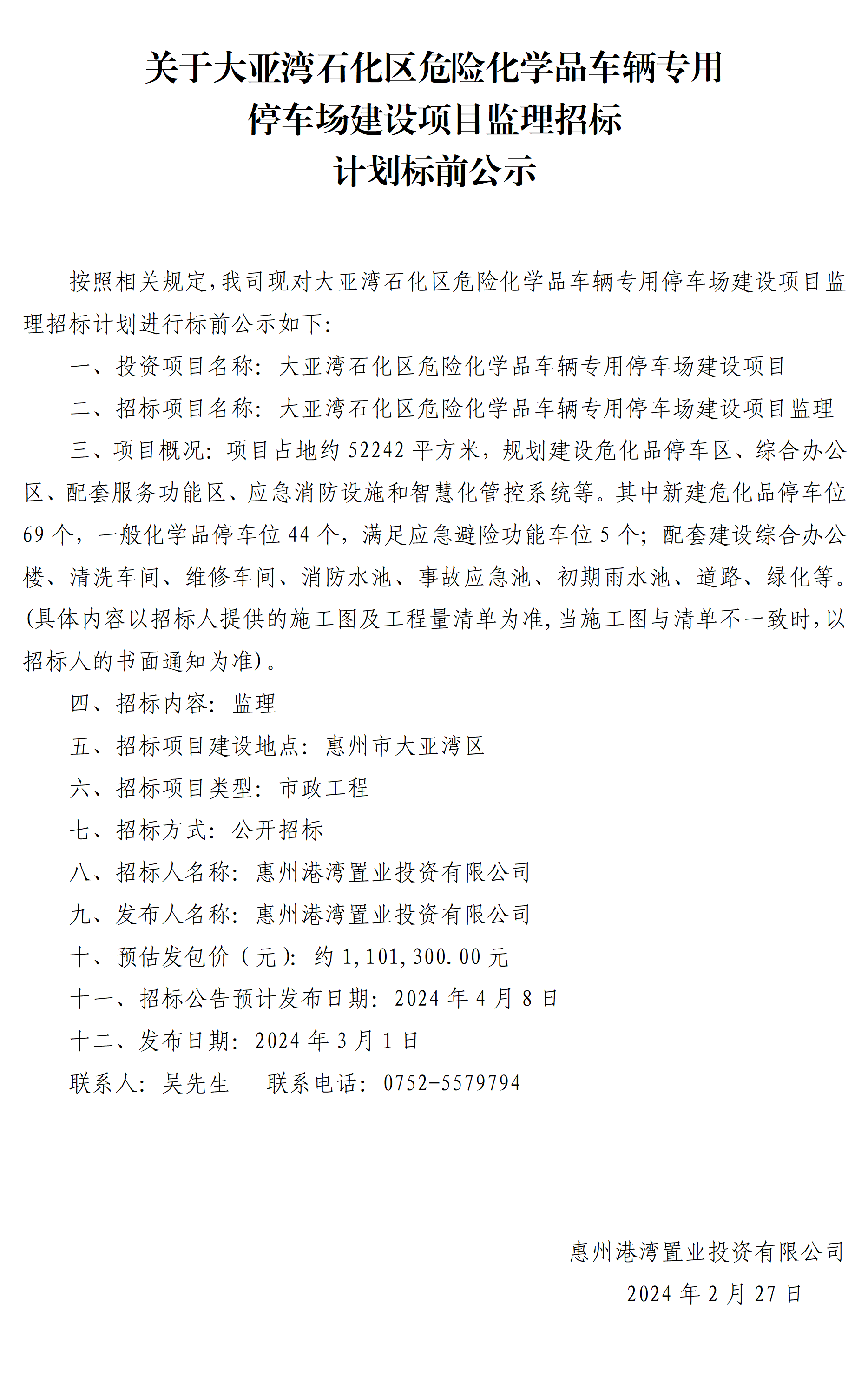 关于大亚湾石化区危险化学品车辆专用停车场建设项目监理招标计划标前公示