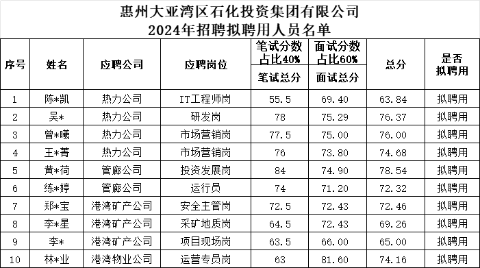 附件:惠州大亚湾区石化投资集团有限公司2024年招聘拟聘用人员名单