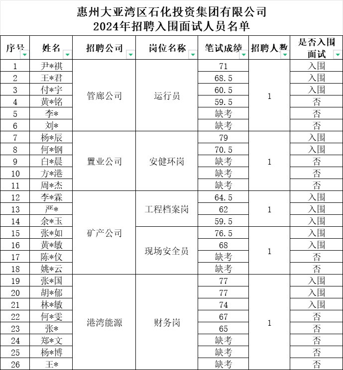 根据《惠州大亚湾区石化投资集团有限公司招聘公告》有关规定,现将惠州大亚湾区石化投资集团有限公司2024年招聘入围面试情况公告如下。