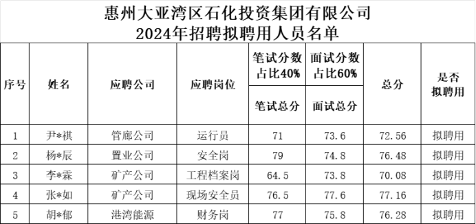 附件:惠州大亚湾区石化投资集团有限公司2024年招聘拟聘用人员名单