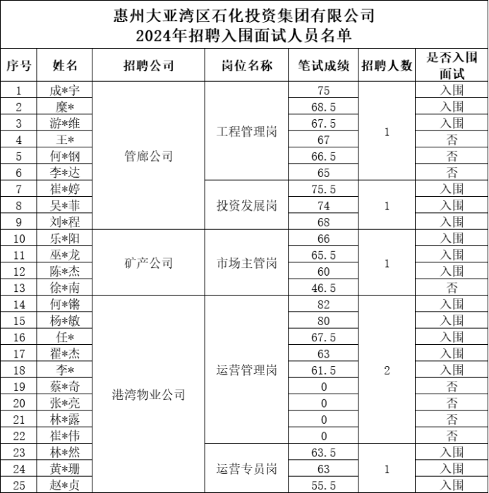 根据《惠州大亚湾区石化投资集团有限公司招聘公告》有关规定,现将惠州大亚湾区石化投资集团有限公司2024年招聘入围面试情况公告如下。