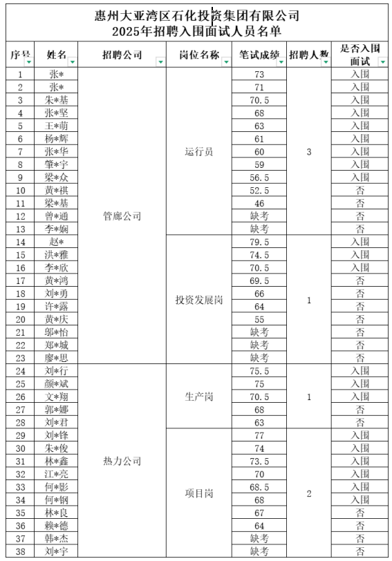 根据《惠州大亚湾区石化投资集团有限公司招聘公告》有关规定,现将惠州大亚湾区石化投资集团有限公司2025年招聘入围面试情况公告如下。