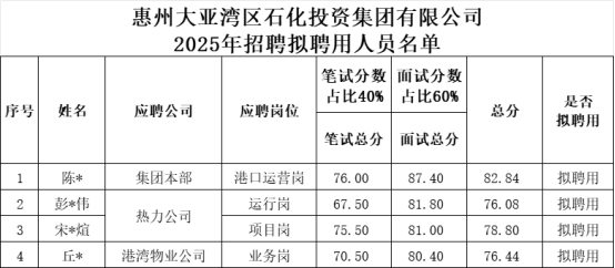 根据《惠州大亚湾区石化投资集团有限公司招聘公告》,经过报名、资格审查和筛选、考核等程序,现将拟聘用人员名单进行公示,有关事项说明如下:
