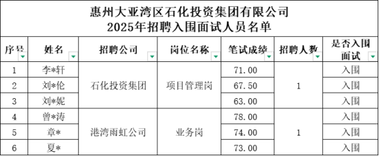 根据《惠州大亚湾区石化投资集团有限公司招聘公告》有关规定,现将惠州大亚湾区石化投资集团有限公司2025年招聘入围面试情况公告如下。