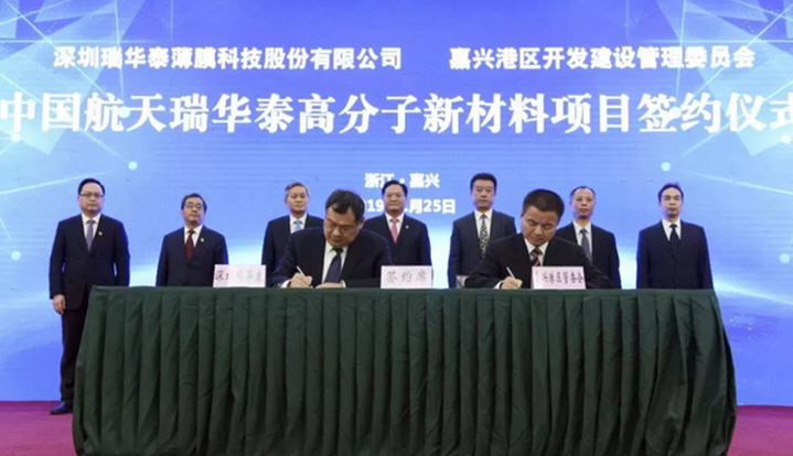 根据嘉兴港区公众号消息,深圳瑞华泰薄膜科技股份有限公司已与嘉兴港区开发建设管理委员会签约,计划总投资115亿元的中国航天瑞华泰高分子新材料项目正式落户嘉兴港区。