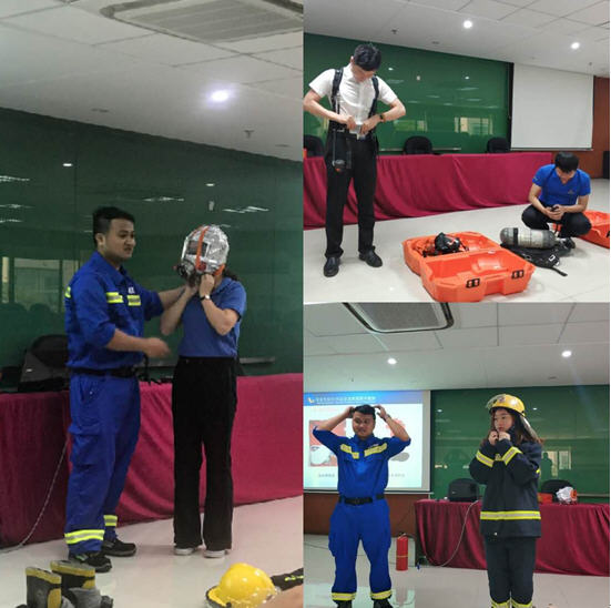 消防知识培训后,教官李金成向全体员工介绍了灭火器、消防战斗服及正压式空气呼吸器的用途、性能、原理和操作方法,并进行了当场示范。全体员工都认真学习了消防器材和装备正确使用的方法,并亲自体验消防器材和装备的使用操作方法。