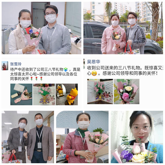 虽然部分女同事因借调在驻点企业参与疫情防控工作及待产、休产假的特殊原因,无法在公司亲身感受,但关爱总会如约而至,赵楠、张伟、陈锦霖、林炜鑫、温志凯自成分队,将公司关爱传递至每一位女神手中。特殊时期,暖心依旧!