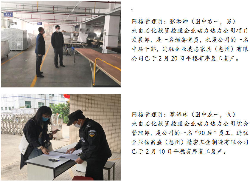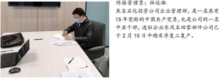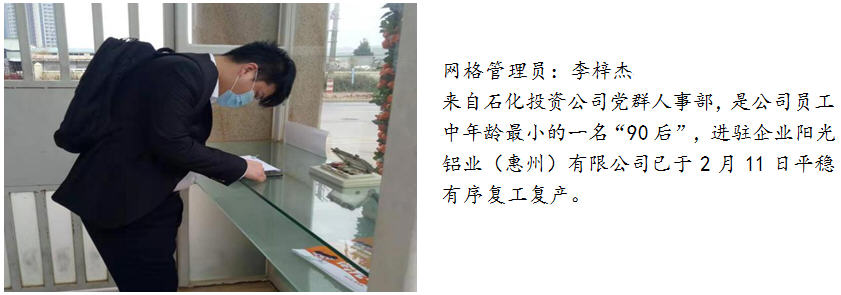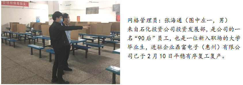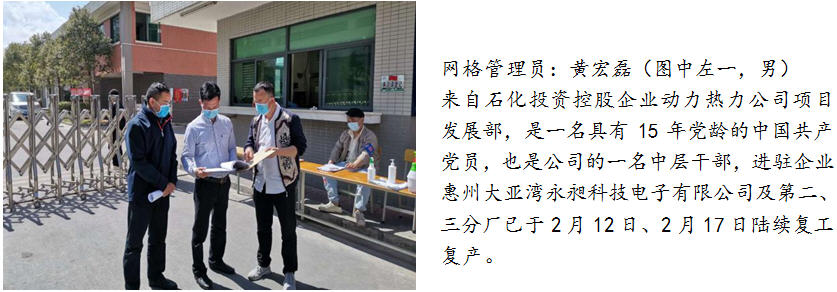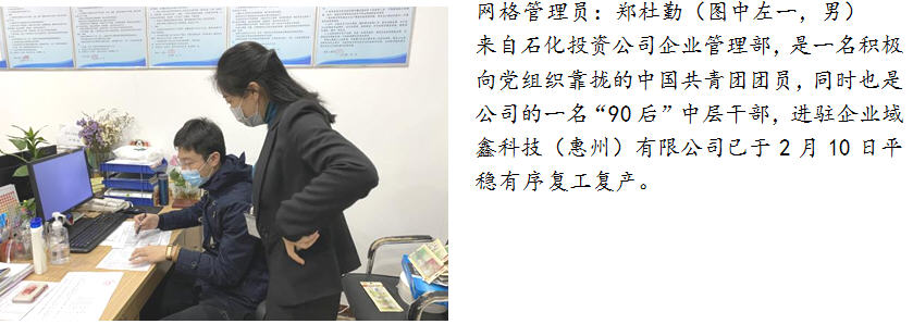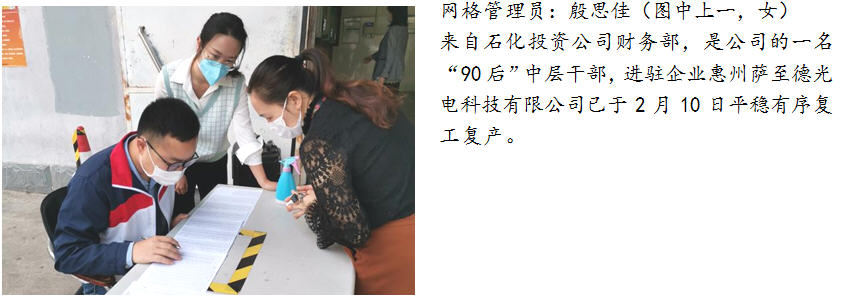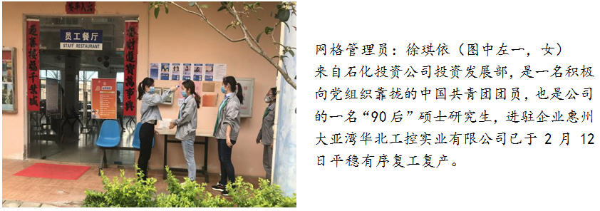 三、勇当全区联防联控的先锋。为支持区委、区管委会在复工复产高峰期的疫情联防联控工作,石化投资积极响应号召,临时抽调10人参与到大亚湾区复工复产疫情防控网格化管理工作中,这部分同志分别来自石化投资公司和控股企业动力热力公司,他们勇于担当、敢于奉献,牢记使命、迎难而上,从目前来看,这部分同志们的工作取得了不错的成果,也得到了网格长及驻点企业的认可和肯定。同时,这部分同志们在做好个人防护的基础上,还需继续努力、戒骄戒躁,保持良好的工作作风,守好自己的责任田,战斗至最后一刻,让青春在党和人民需要的地方绽放绚丽之花。