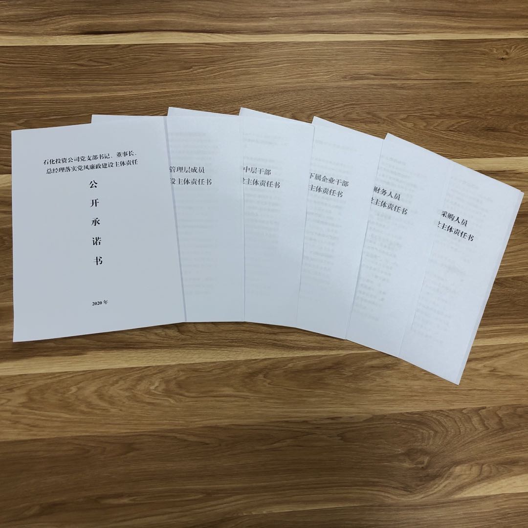 石化投资继续坚决贯彻落实党风廉政建设责任制,强化领导干部的主体责任和“一岗双责”,2020年年初,公司党支部书记、董事长、总经理刘平凡同志带头签订《落实党风廉政建设主体责任公开承诺书》,随后刘平凡书记与班子成员、分管领导与各中层干部及关键岗位工作人员之间分层签订了廉政责任书,以上率下、层层压实,使公司的党风廉政建设责任体系更加坚实,进一步筑牢拒腐防变的思想道德防线,增强全体干部职工的廉洁自律意识。