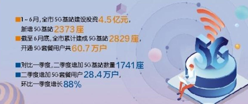 1~6月,全市新增5G基站2373座。对比一季度,二季度增加5G基站1741座;二季度增加5G套餐用户28.4万户,比一季度增长88%。