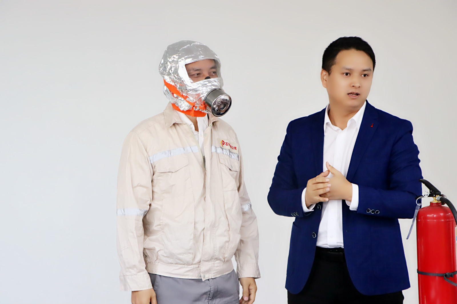 根据讲解要领,所有参练人员轮流穿戴过滤式消防自救呼吸器并亲自体验了干粉灭火器现场灭火的过程。面对熊熊燃烧的火堆,参练人员在安健环部的指导下,遵照使用方法和步骤严格的使用灭火器材,将演习大火迅速扑灭,做到了冷静沉着应对突发火情、成功快速扑灭明火的消防标准。